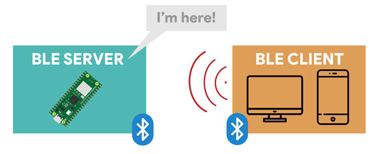 De ene Rpi Pico (de BLE-server) scant naar de nabij aanwezige andere Rpi Pico (de client), connecteert deze draadloos, registreert de overeenkomstige GATT-informatie, adverteert deze informatie en zend de actuele CPU-temperatuur door naar de BLE-ontvanger (de client).